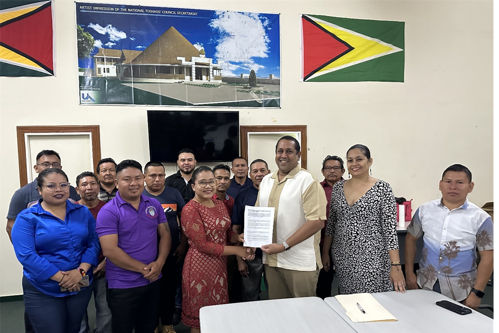 The simple signing ceremony held at the NTC’s Hadfield Street Secretariat was attended by Vice Chairwoman, Toshao Sonia Latchman, Iwokrama’s CEO, Mr. Dane Gobin,  Director for Resource Management and Training, Dr. Raquel Thomas, and Iwokrama Special Projects and Certification Coordinator – Anne-Marie Ford and Executive Members of the NTC.