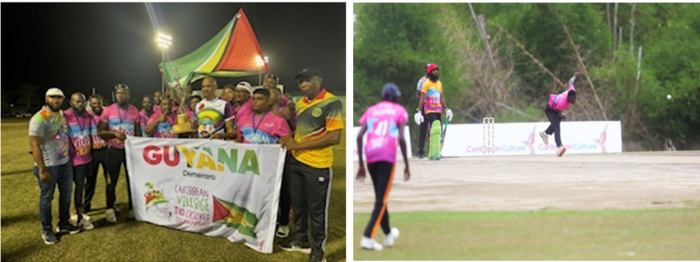 From Left Caribbean Airlines CEO, Garvin Medera with Team Demerara, Guyana, winners of the Caribbean Airlines Village Cricket T10 Tournament;  and Team Demerara, Guyana in action against Team Southeast, Trinidad.
