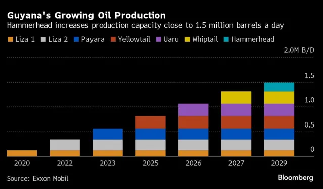 The Hammerhead project will pump as much as 180,000 barrels a day as soon as 2029, pending Guyanese government approval, Exxon country manager Alistair Routledge said in an interview.