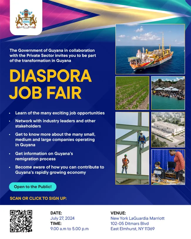 The Government of Guyana, in collaboration with the private sector, is pleased to announce a Job Fair aimed at Guyanese in the diaspora, to be held on July 27, 2024, at the La Guardia Marriott, 102-05 Ditmars Blvd, Queens, New York, from 9 a.m. to 5 p.m.