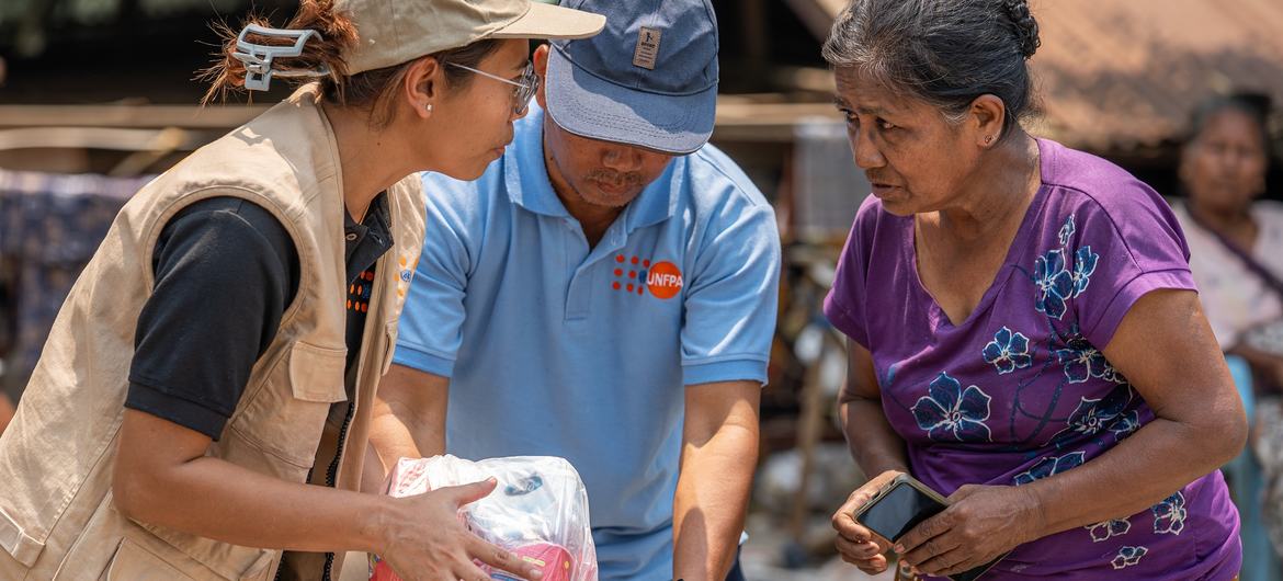 UNFPA Myanmar A UNFPA staff member distributes relief supplies to a woman affected by the March earthquakes in Myanmar.