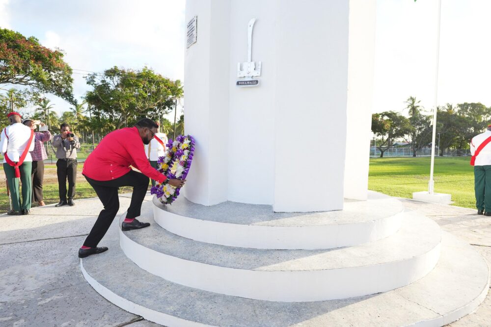 President Irfaan Ali laying a wreath at the Enmore Martyrs Monument- June 16, 2025
