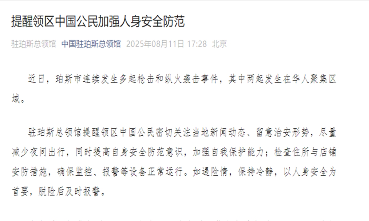 The Chinese Consulate-General in Perth, Australia, issued a safety alert to Chinese citizens in its jurisdiction on Monday after a series of violent incidents, including multiple shootings and arson attacks, were reported in the city in recent days. Two of the incidents took place in areas with a high concentration of Chinese residents.