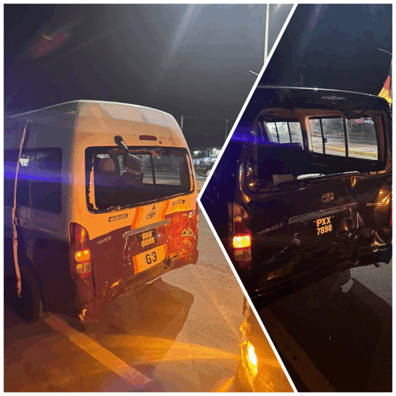 The incident reportedly occurred when an unidentified vehicle suddenly exited the LBI Access Road into the path of the convoy, forcing the escort vehicle to brake abruptly. This resulted in a chain-reaction collision—Minibus #BAB 6899 braked sharply, causing Motor Car #PXX 7899 to collide with its rear, and Minibus #BAL 2180 then crashed into the rear of the car.