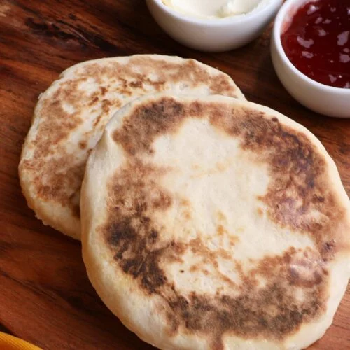 - Add a cast iron skillet or a tawa to medium heat. When hot, add as many of the rolled out bakes that can fit without touching. Cook for about 2 minutes until the bake is golden brown on the side touching the pan, then flip.