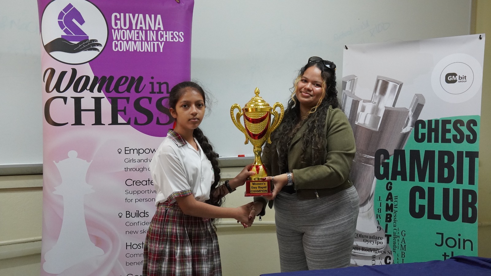 Eleven-year-old Divya Persaud took home the first-place trophy for her standout  performance at the Women’s Day Rapid Chess Tournament hosted by the  Gambit Group. The event, a collaboration among the Gambit Group, Guyana  Chess Federation’s Women in Chess, and the School of the Nations, was held on  Friday, March 6, 2026, to commemorate International Women’s Day. A total of  24 females accepted the invitation to compete from various schools, including  School of the Nations, Marian Academy, St. Joseph High, St. Rose’s High, Christ  Church Secondary, Richard Ishmael Secondary, New Guyana School, St. John’s  College, and Mae’s Primary School.