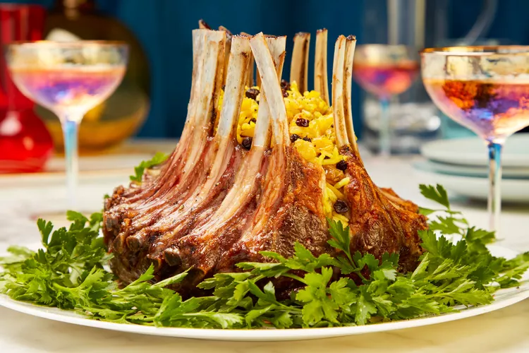 3. While the lamb roasts, fluff the rice and add it to a large bowl. Add the parsley and toss to combine. Season with remaining 1 teaspoon salt and remaining 1/2 teaspoon pepper to taste. Stuff 2 cups of the jeweled rice into the cavity of the par-roasted crown roast and spoon the pan juices on top of the jeweled rice. Cover the remaining jeweled rice to keep warm. (If there are no pan juices and the rice seems dry, dot the top with butter or drizzle with some chicken stock, or both). Return the roast to the oven and cook for another 10 to 15 minutes, until the rice forms a crust on top and an instant-read thermometer inserted into the thickest part of the lamb chop registers 130°F for medium-rare or 135°F for medium. Let the lamb rest for 15 minutes before carving. Top sliced lamb chops with flaky sea salt then serve with remaining jeweled rice on the side. (foodandwine)