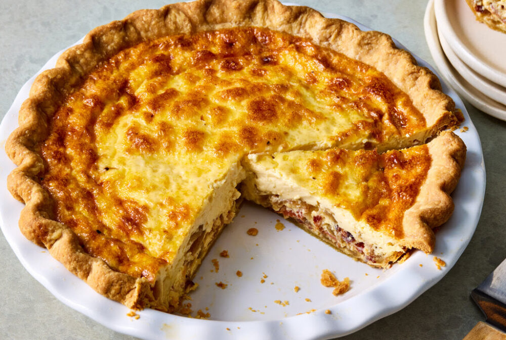 Strain the cream mixture over the onion-cheese mixture. Slide the pie onto a baking sheet.