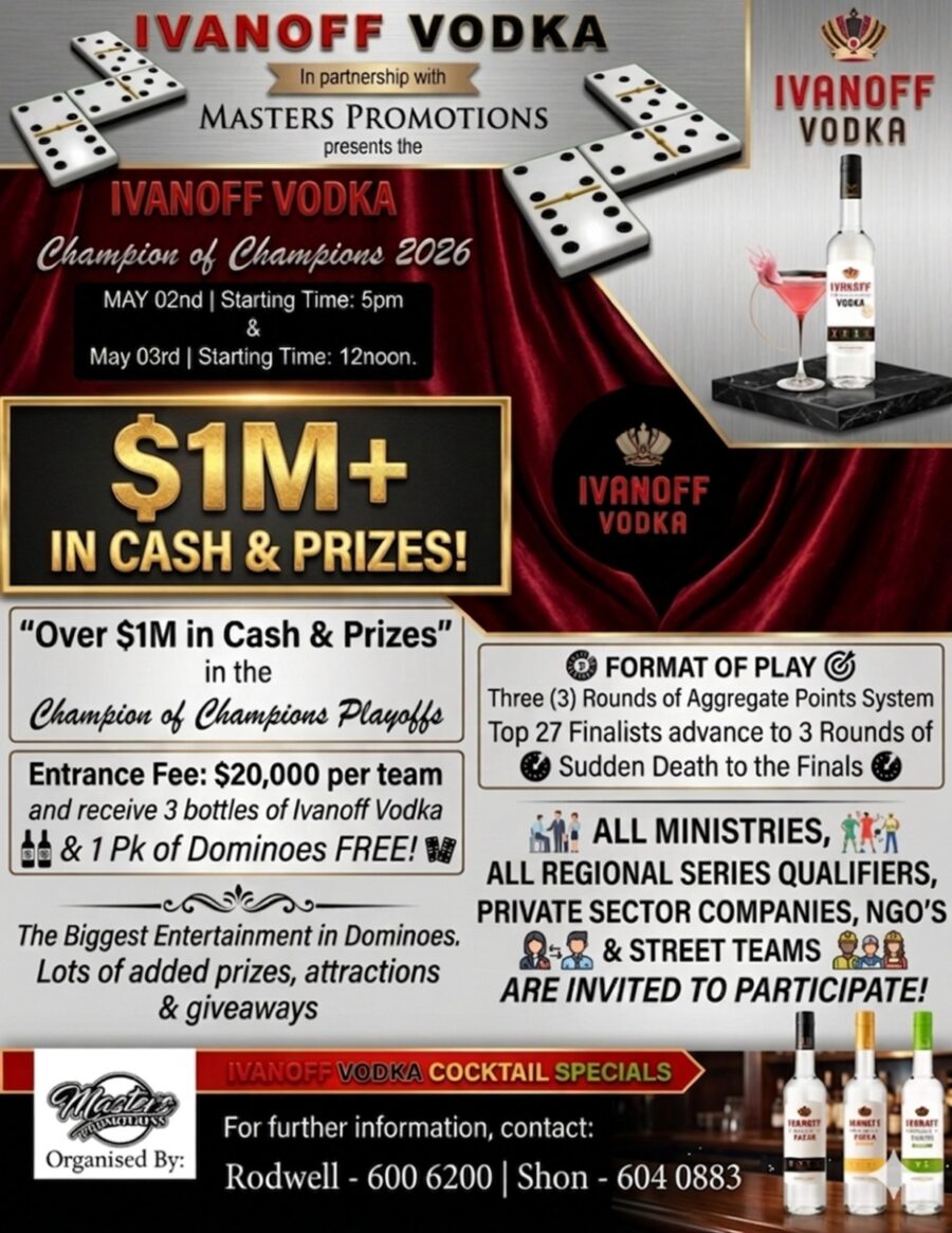 Launched in February of this year, the annual Masters Promotions/Ivanoff Vodka Nationwide Domino Tournament has been in full effect in all ten (10) Administrative Regions across Guyana. Nail biting competitions have been executed in Linden, West Bank and West Coast Demerara, Lethem, East Coast and East Bank Demerara, Mahaicony, New Amsterdam, Charity, Bartica, Georgetown and other areas. Victorious teams have earned trophies, cash prizes and a grand opportunity to participate in the Playoffs scheduled for May 1-3 2026 at the Sophia Exhibition Center in Georgetown. Additionally, Ivanoff Vodka bottle prizes and dominoes have been distributed to all teams that have signed up in every leg of the tournament.